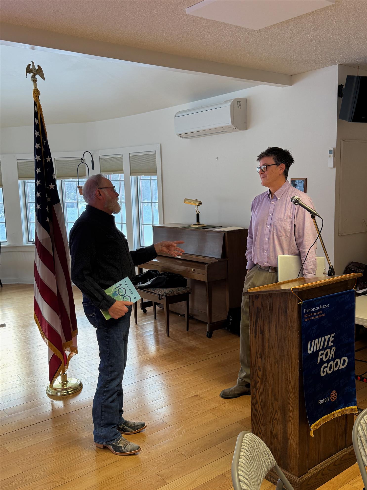 New member Roger Hill (L) is presented with his new membership packet by Richard Fox, Esq. (R)